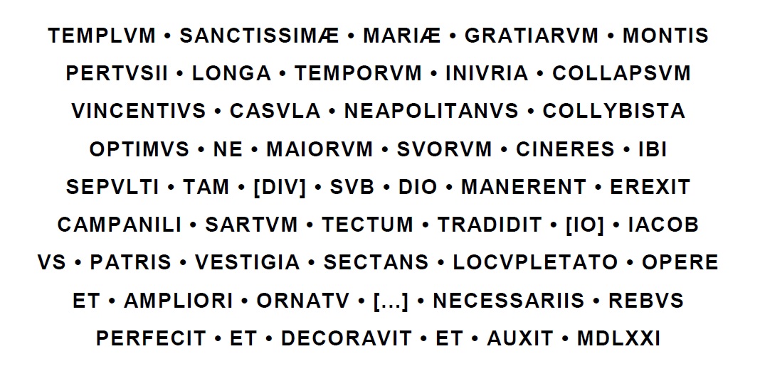 Vincenzo Casola, ottimo cambiavalute napoletano, affinché le ceneri dei suoi antenati ivi sepolti non rimanessero ancora a lungo esposte alle intemperie, riedificò questo tempio della Santissima Maria delle Grazie di Monte Pertuso, crollato per le ingiurie di lunghi anni; eresse il campanile e, riparato il tetto, affidò al figlio il compito di continuare l’opera. Giovanni Giacomo, seguendo le orme paterne, completò la ricostruzione del tempio, lo decorò e lo ingrandì arricchendolo di nuove opere e ampliandone il corredo delle cose necessarie. Anno 1581